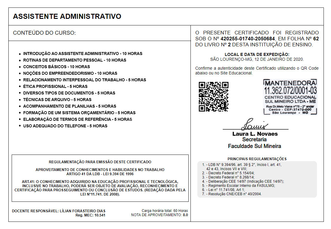 - NO VERSO DO CERTIFICADO, CONSTA O CONTEÚDO PROGRAMÁTICO COMPLETO DO CURSO, CARGA HORÁRIA, NOTA DE APROVEITAMENTO DO ALUNO, NÚMERO DE REGISTRO DO CERTIFICADO E QR CODE, QUE POSSIBILITA A CONFIRMAÇÃO DA AUTENTICIDADE DO CERTIFICADO. SEGUE ABAIXO O MODELO DO CERTIFICADO DOS CURSOS LIVRES ONLINE: